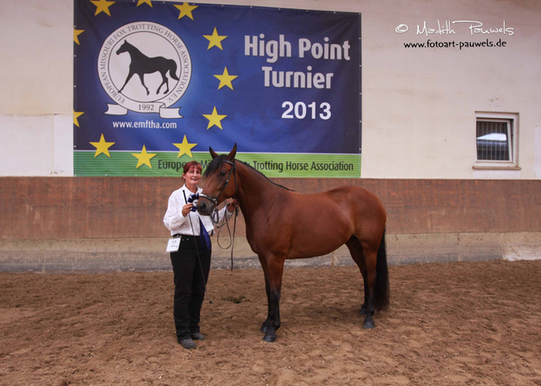 Lucia verkörpert den perfekten Foxtrotter in jeder Hinsicht. Ihr perfektes Exterieur und ihre Schönheit macht Lucia zu DEM Foxtrotter. Gait, Rhythmus ohne Fehler absolut natürlich. Sie ist eine Gangmaschine mir enormer Bewegung. Sie tritt sehr weit unter und hat einen Schub in der Hinterhand als hätte sie einen Düsenantrieb. Demzufolge kommt sie vorne sehr weit raus. Lucia hat mehrere erste Plätze in Gait und Model erreicht. Wenn sie auf Turnieren gezeigt wird, ist sie immer vorne dabei. Lucia ist 3 Gait Grand Champion. Auf der Kokopelli Ranch ist sie das Zugpferd. Ohne sie geht nichts, absolut verlässlich in jeder Situation. Sie wurde bereits mit zwei verschiedenen Hengsten gedeckt, beide Nachkommen sind sehr gute Nachwuchshengste. Lucia ist eine Zuchtstute der Sonderklasse. Lucia wird im Sommer 2015 mit Pawnee gedeckt, dieses Fohlen wird sicherlich einmalig werden nicht nur im Gebäude und Gänge sondern auch in der Farbe. Es wird ein Gewichtsträger mit der Größe von ca um die 1.60 werden.  Lucias Gänge sind genetisch fixiert verankert.